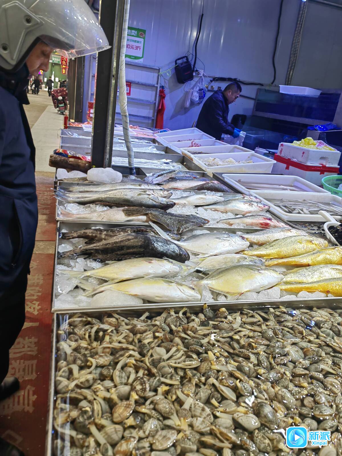 海鮮攤位上各種海鮮琳瑯滿目,市民駐足詢問“開凌梭”價(jià)格。