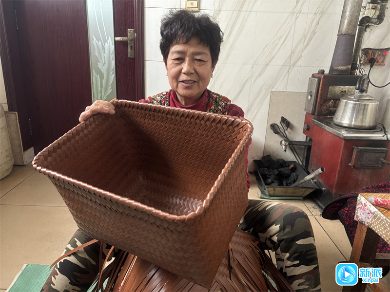 徐秀芳展示編織好的收納筐。