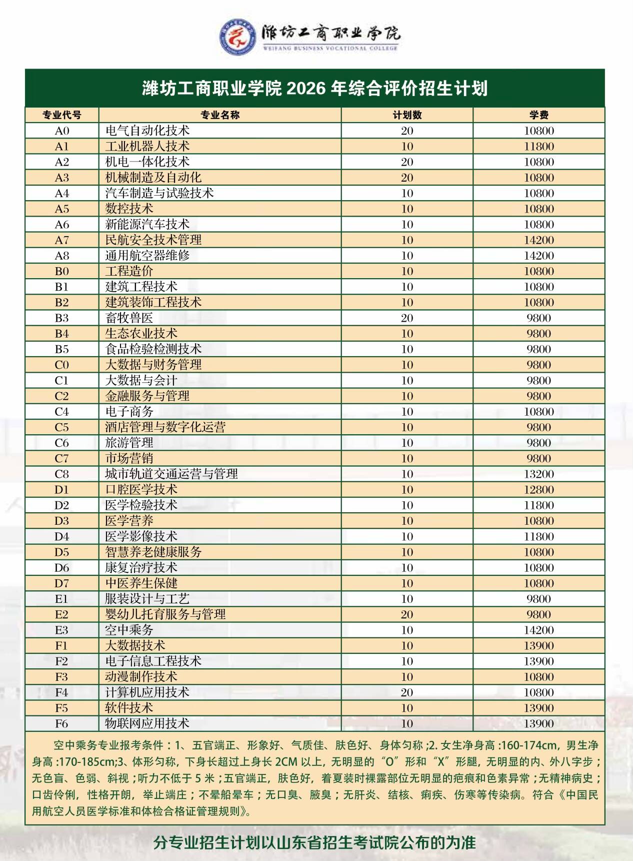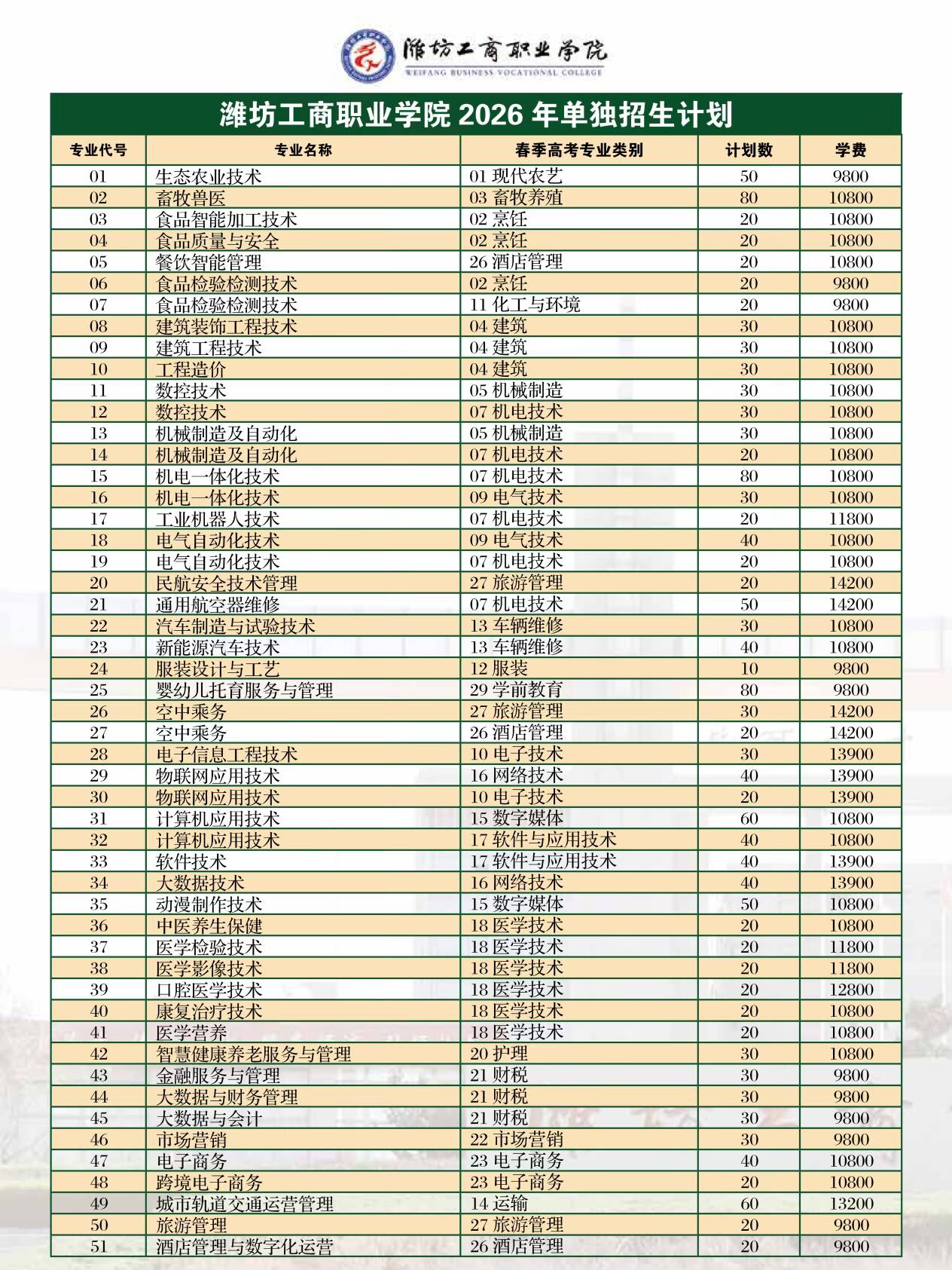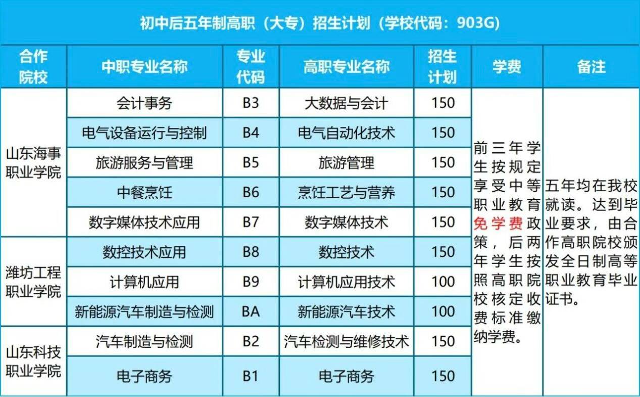 濰坊技術(shù)中等專(zhuān)業(yè)學(xué)校初中后五年制高職招生計(jì)劃: